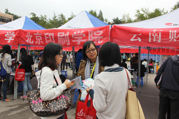 此次研究生招生现场咨询活动在天津、山东、黑龙江、云南等地区共举办10场。2013年9月7日研招办工作人员和熟悉相关学位点情况的专业教师参加在云南大学举办的现场咨询。在咨询活动现场我校老师与学生及家长进行了面对面、一对一的交流。通过宣传学校的学科特色和优势、介绍学校优秀导师队伍、解答学生考研相关问题,热情欢迎同学们积极报考北京印刷学院。同学们咨询的问题集中在硕士学位点设置情况、历年录取分数、就业前景等方面。当地学生对我校的少数民族骨干人才招生计划表现出了极大的兴趣和意向。