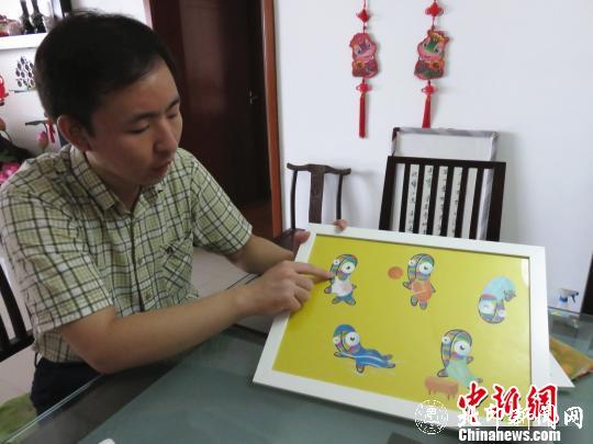 今年27岁的北京男孩崔欣晔,是南京青奥会吉祥物砳砳的设计者。 他以“图腾”和“雨花石”为基础,设计出了“彩娃”和“石娃”两个,后者便是今天闻名大街小巷的“砳砳(lèlè)”的前身。图为崔欣晔展示“彩娃”设计图。 曾鼐 摄
