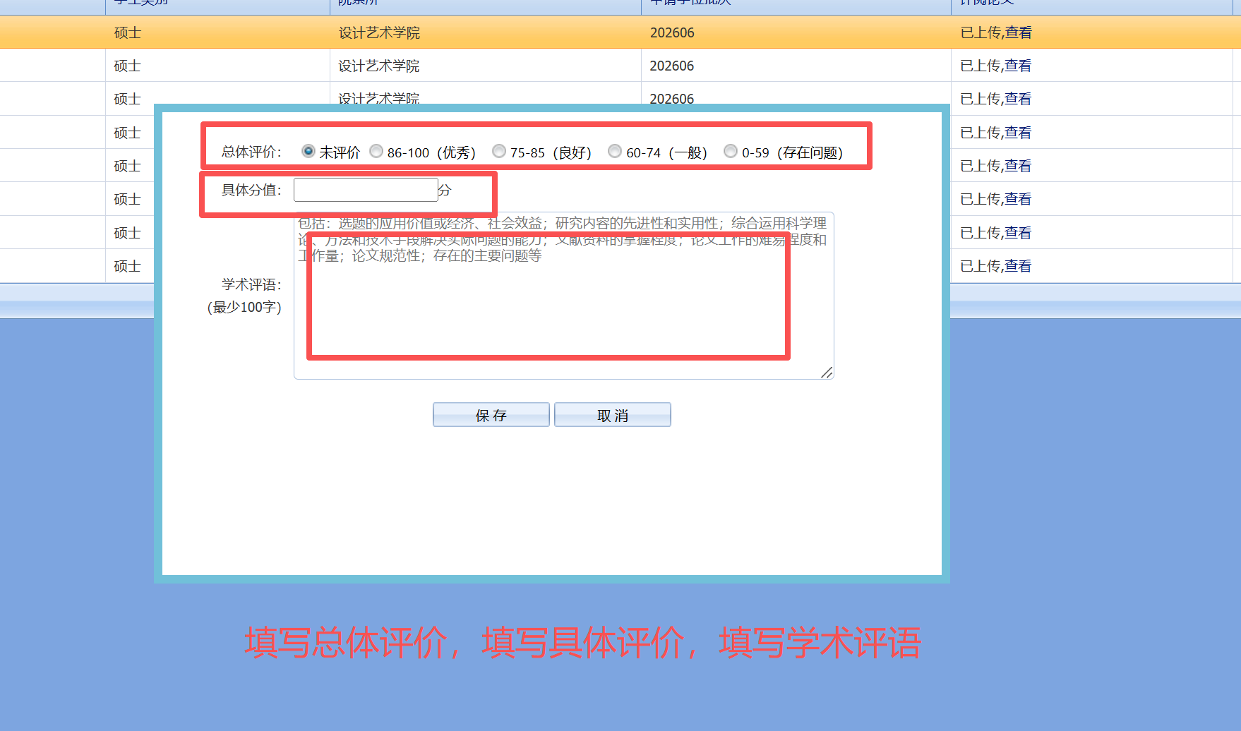 (4)进入评阅页面后,填写“学术评语”,评定“具体分值”,勾选“总体评价”,确认无误后,点击“保存”。