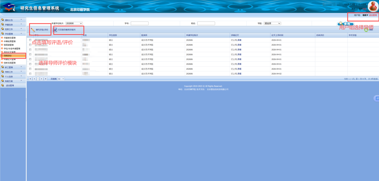 (5)在学生名单列表中勾选对应研究生名单,点击列表上方“打印指导教师评阅书”,打印签名后,将纸质版评阅书提交二级学院汇总。