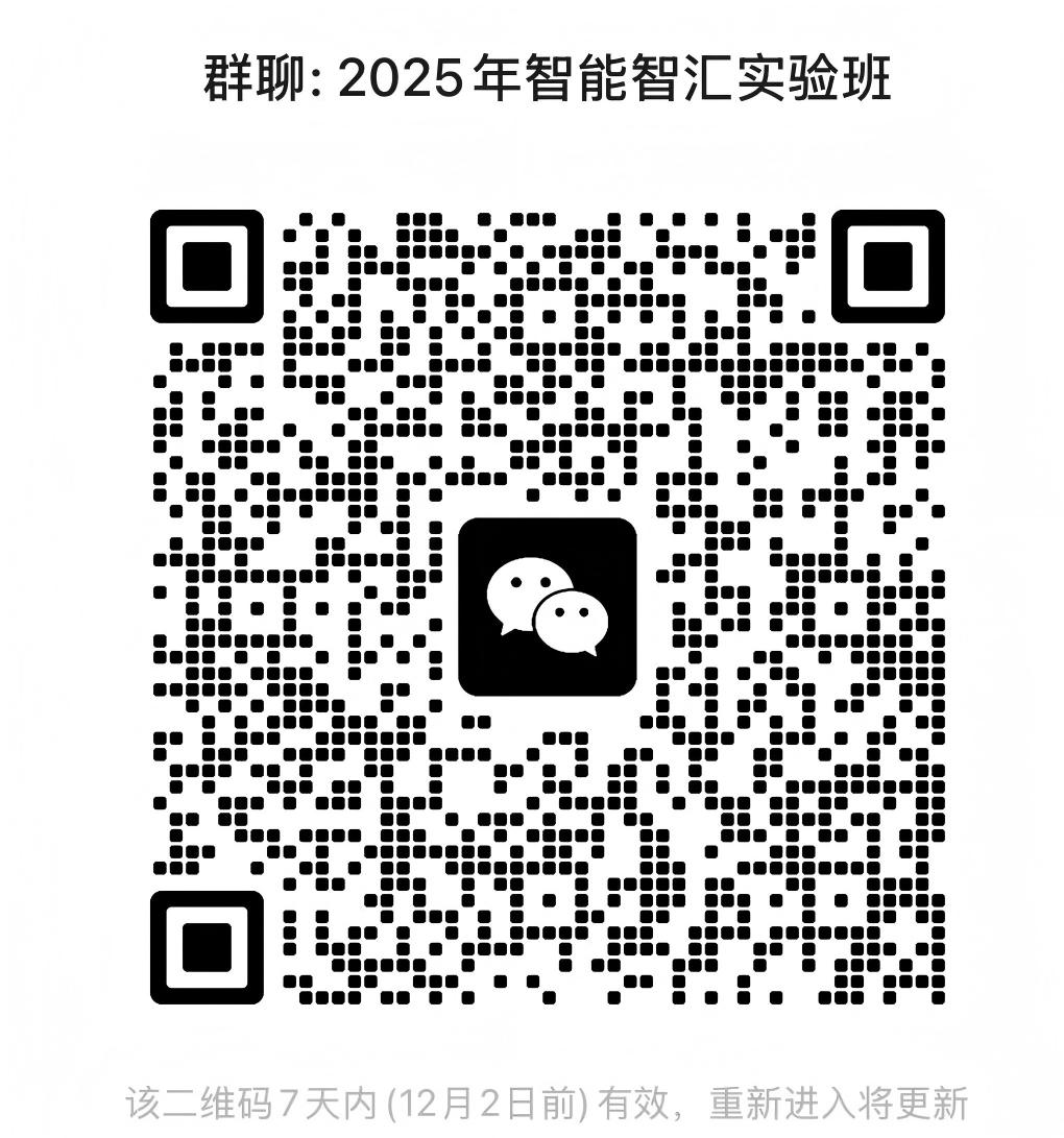 2.报名方式:研究生登录“研究生信息管理系统”,点击“我的研工”--“活动报名”,选择“2025年度“智能智汇”项目进行报名。审核通过视为报名成功。报名成功的同学请扫描以下二维码进入课程班级群。