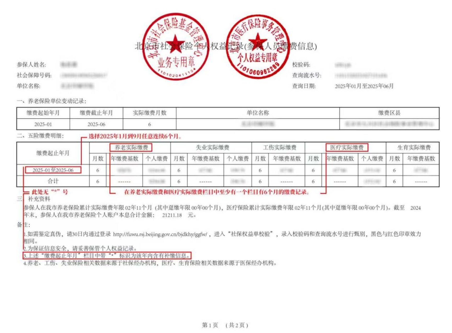 8.社保缴纳记录:要求考生到“北京市人力资源和社会保障局官网”上查询打印,缴费起止年月选择2025年1月到2025年9月之间的任意连续6个月(如:2025.01-2025.06、2025.02-2025.07……2025.04-2025.09),上传时需对网站上下载生成的《参保人员缴费信息》PDF文件进行截图上传(文件中应带有“北京市社会保险基金管理中心业务专用章”和“北京市医疗保险事务管理中心个人权益专用章”),缴费明细部分中,缴费起止年月栏目中不能带有“*”号标识,在养老实际缴费和医疗实际缴费栏目中至少有一个栏目有6个月的缴费记录。示例如下图。