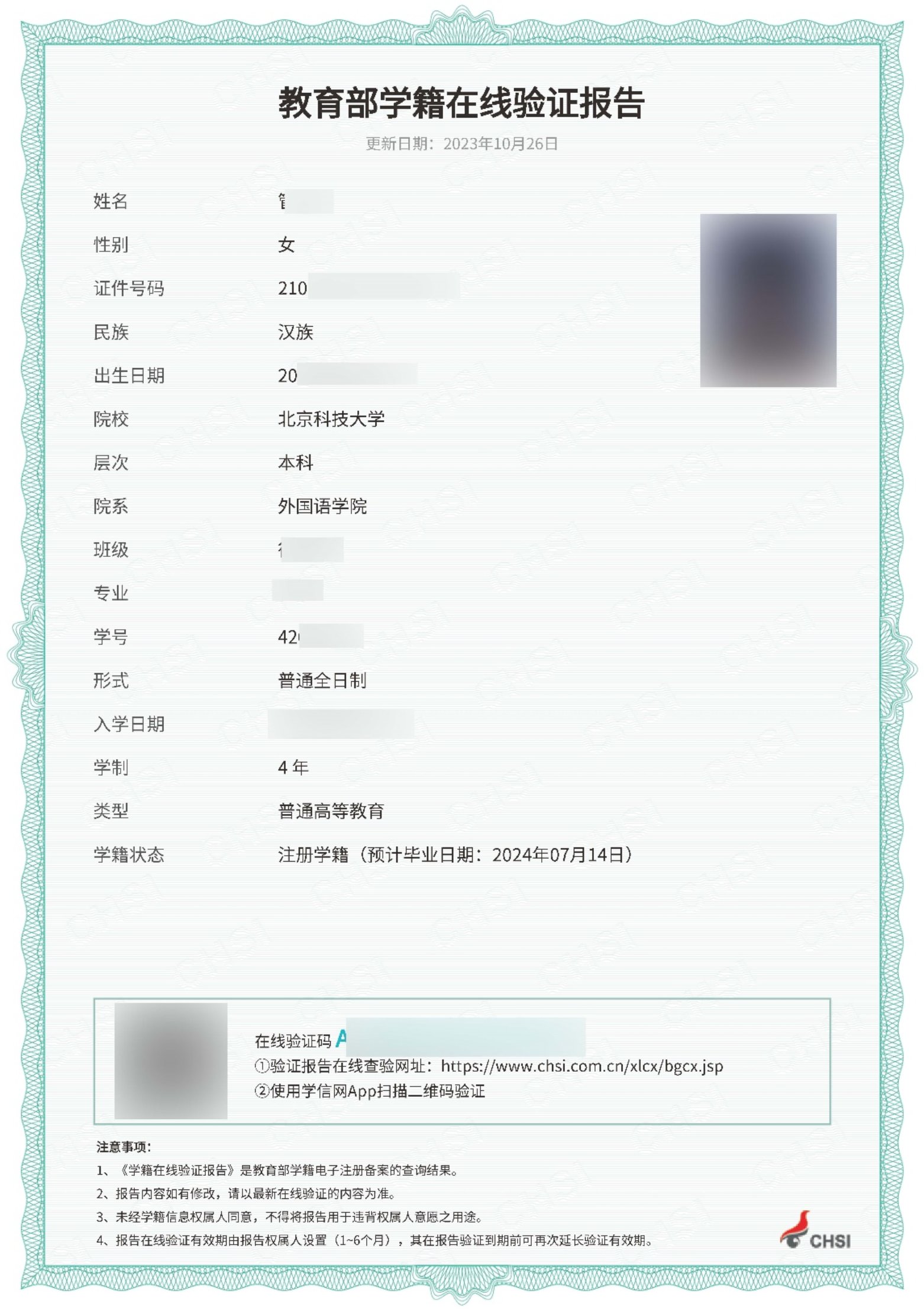 4.教育部学籍在线验证报告:示例如下图。