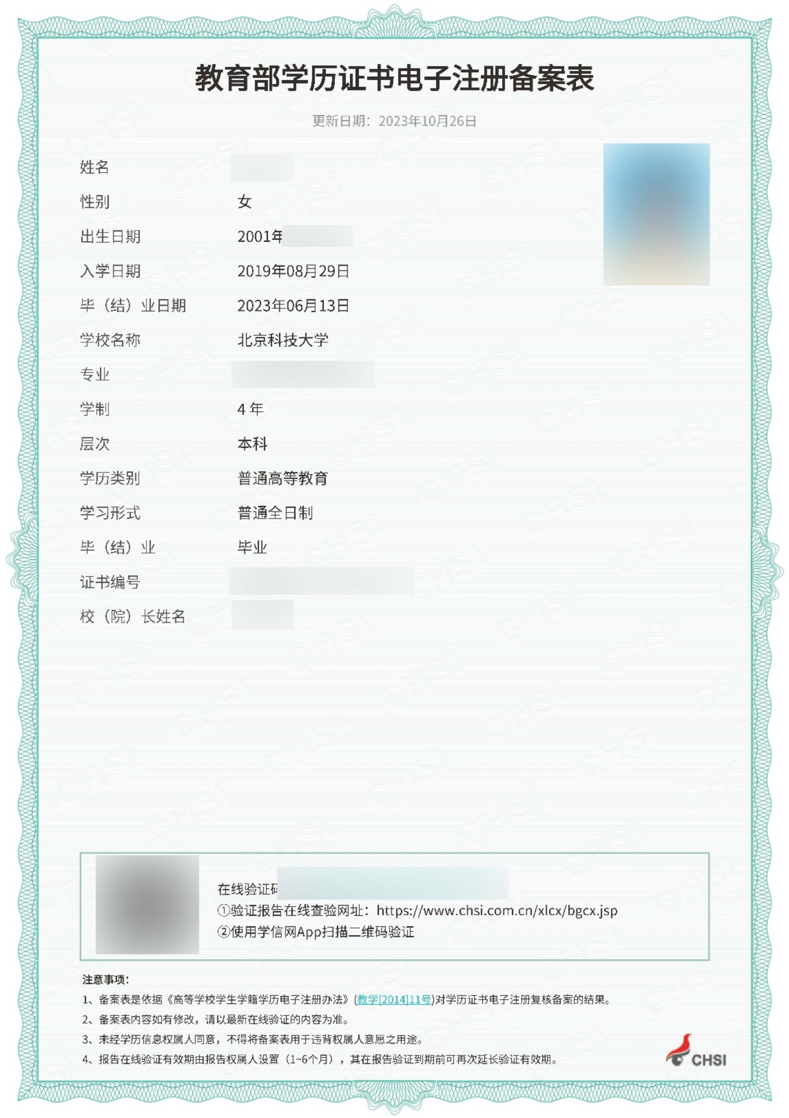 5.教育部学历证书电子注册备案表:示例如下图。